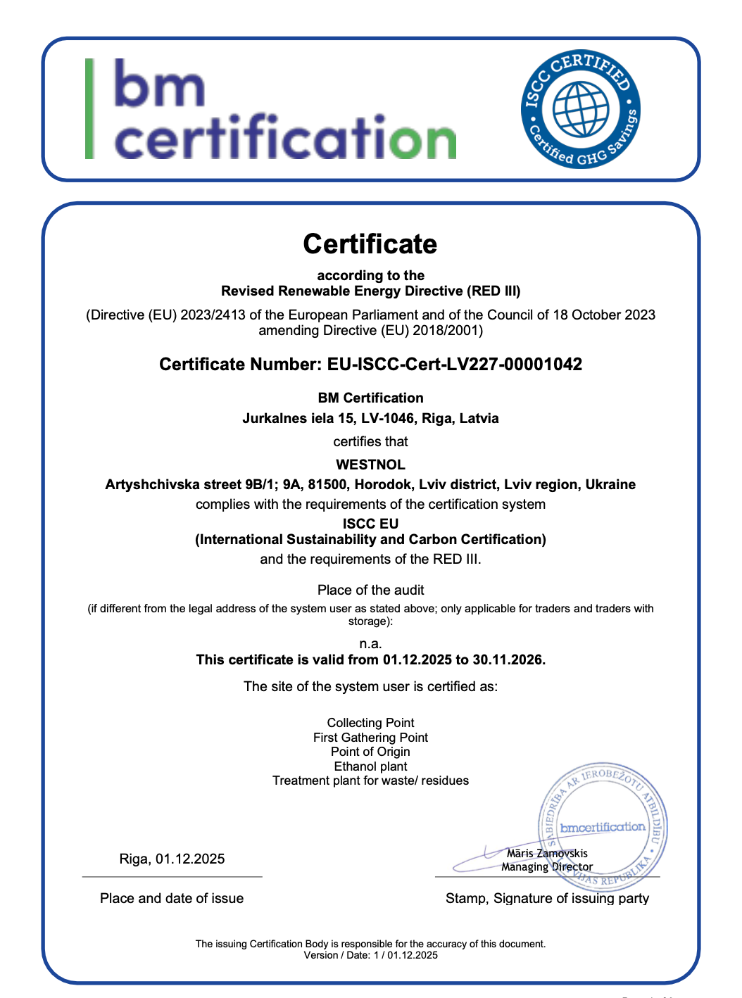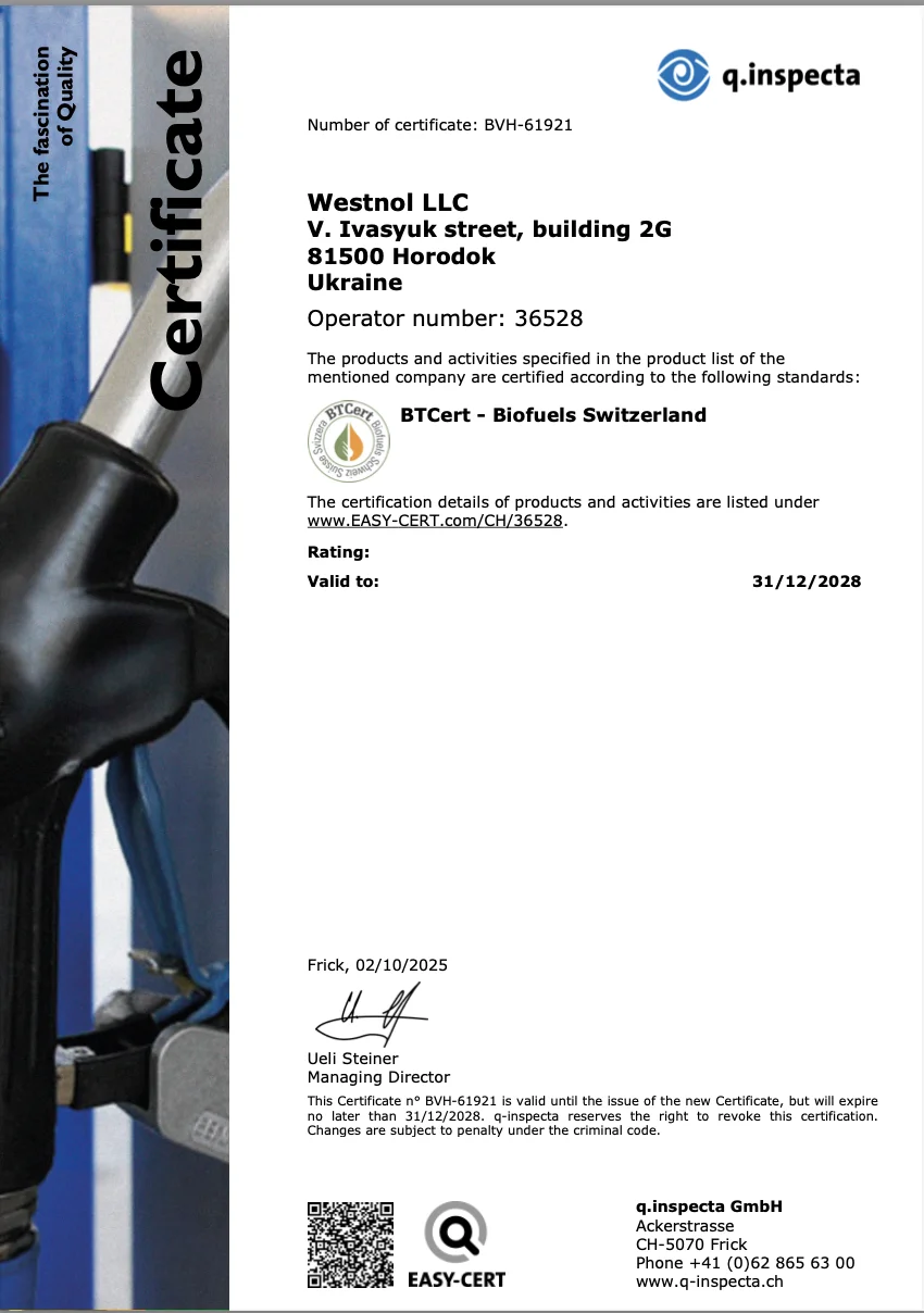 Our products have high quality standards confirmed by a number of international certificates, such as: The ISCC EU certificate, which shows our contribution to sustainable development, the minimization of greenhouse gas emissions, and the GMP+ certificate, which is a recognized global standard for safety and quality in the production of animal feed. These awards confirm our commitment to the highest standards and guarantee our customers the safety and quality of our products.